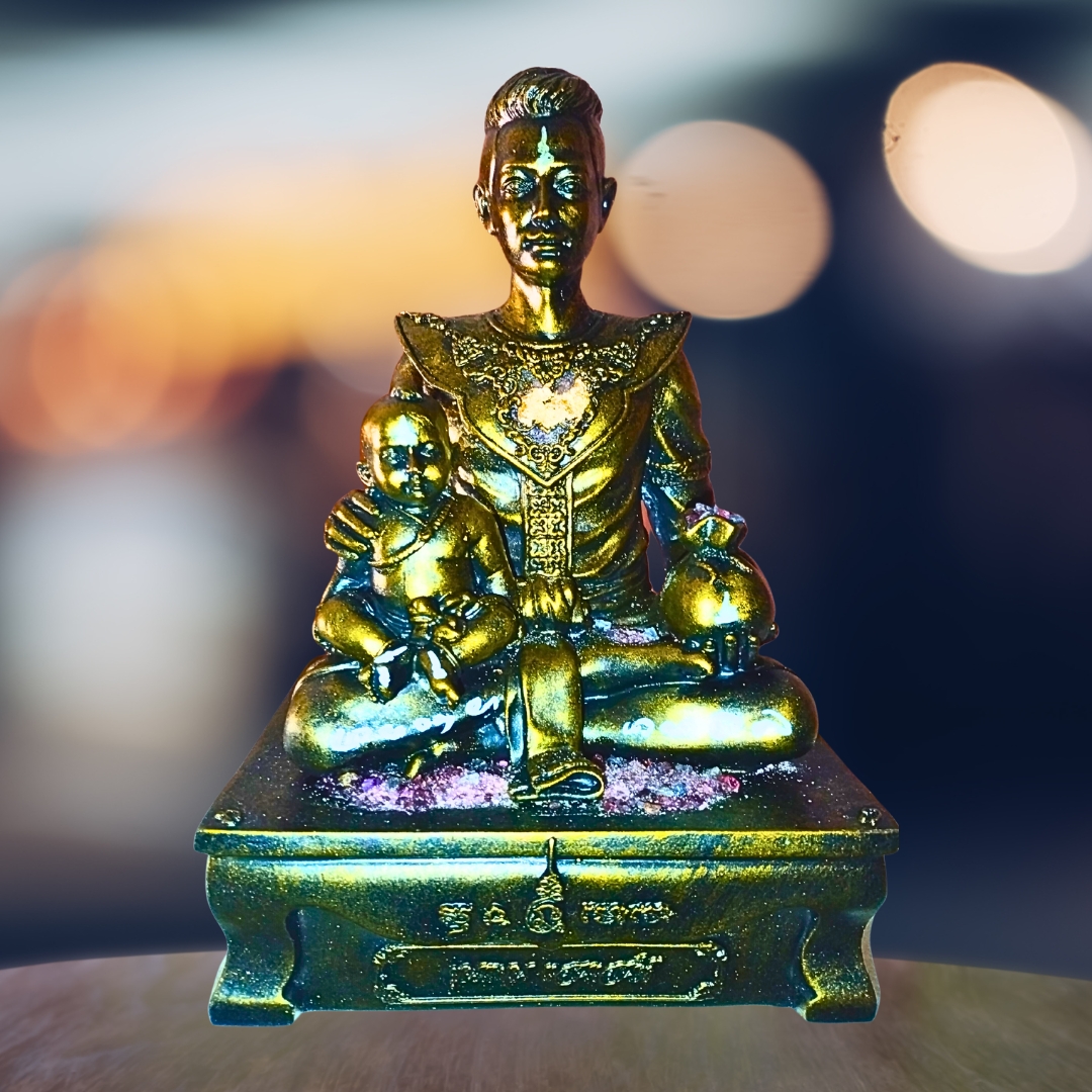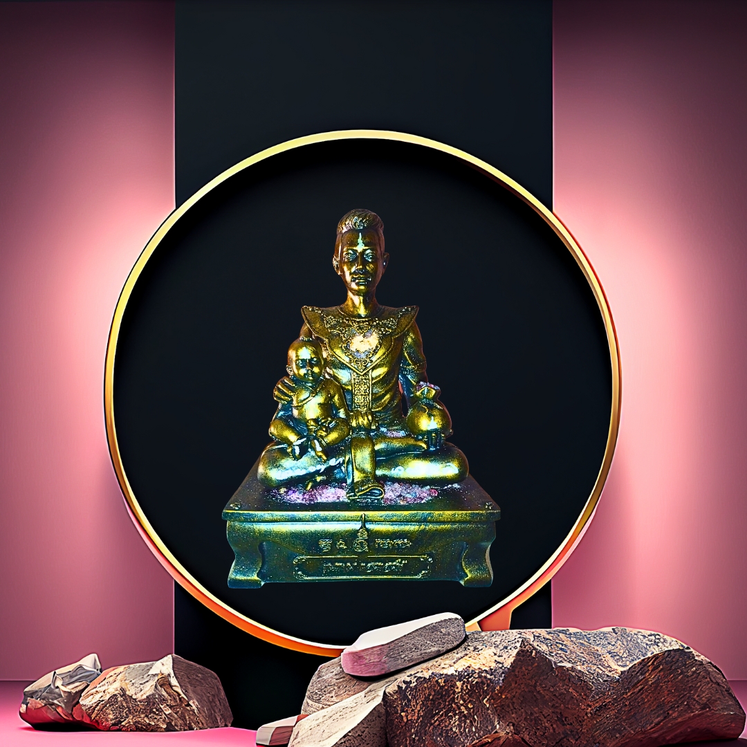 Step into a realm where magic, charm, and valor coalesce in the form of this exquisite Khun Paen Warrior Statue, a masterpiece that encapsulates the aura of a legendary figure revered across generations. Crafted with the utmost precision, this captivating statue doesn’t merely replicate Khun Paen’s visage; it encapsulates his very essence. And perched upon his lap, as if held in a sacred covenant between father and son, is his magical child Kumantong, a powerful entity in its own right, revered for its luck-altering abilities.