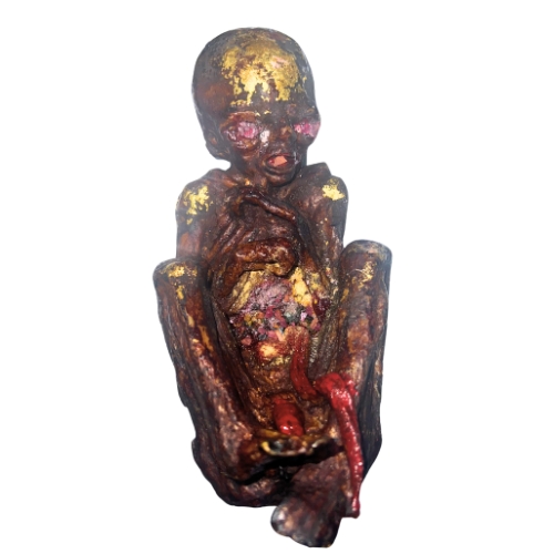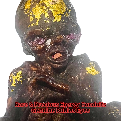 Furthermore, this extraordinary effigy incorporates meteorite grains, offering a cosmic link and embodying the vastness of the universe’s energy. The mixture also includes 108 different types of sacred soil, 9 cemeteries soil, each sourced from revered cemeteries known for their spiritual power, alongside soils collected from nine esteemed temples. These elements together create a powerful conduit for the Luk Kok entity, enabling it to reside within the vessel with enhanced potency. This unique composition ensures that the Luk Kok is not only a guardian of material wealth but also a profound spiritual guide, facilitating a deep and meaningful connection between the spiritual and earthly realms.