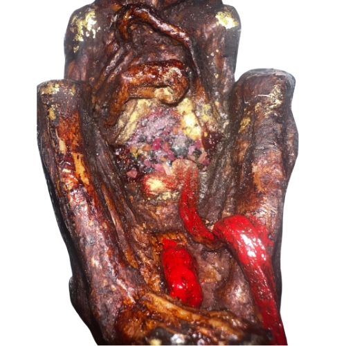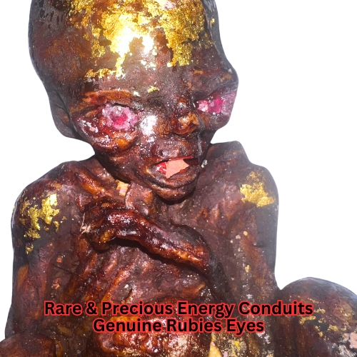 This Luk Kok is meticulously crafted from an array of rare and sacred materials, each selected for its profound spiritual significance and potency. The core of this sacred effigy includes ancient relics that carry the essence of spiritual wisdom accumulated over centuries. Its eyes are set with genuine rubies, vibrant gemstones that symbolize protection and spiritual insight, enhancing the Luk Kok’s ability to foresee and guide towards prosperity. The inclusion of ashes and prai kuman powder imbues the vessel with a deep connection to the spiritual realm, anchoring the Luk Kok’s presence in the physical world.